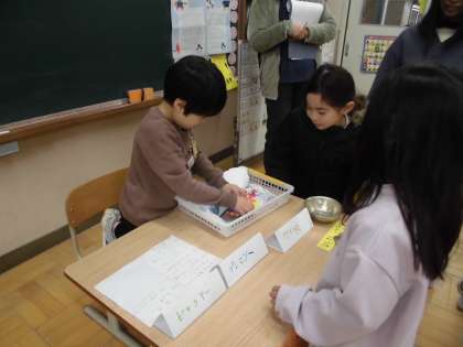 社会見学で見てきた商店街のお店の様子をもとに自分たちで作ったお店に1年生を招待して「ひかり商店街」を開きました。パン屋さん、魚屋さん、ジュース屋さんなど自分たちの作ったお店にたくさんのお客さんが来てくれて、みんな嬉しそうでした!