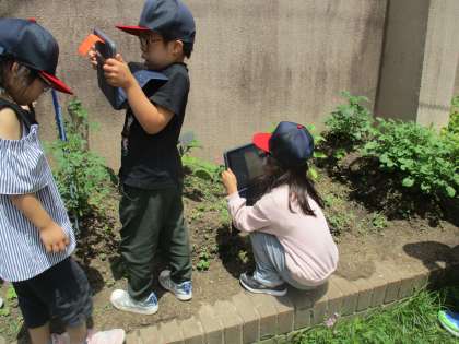 水やりに行くと、「花が咲いてる!」「トマトは実ができてる!」とうれしそうな子どもたち。