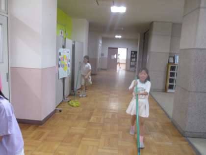 年下の友だちにやさしく教えながら掃除をする姿が見られました。
