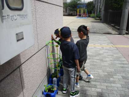 中間休みにも朝顔を見に行っていた子たちがいました。つるが支柱に巻いているのを嬉しそうにみていました。