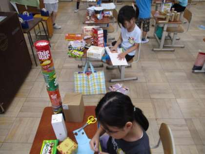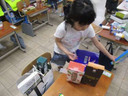 算数でも学習をした箱を使って、図画工作の学習をしました。箱の形を生かして作品作りを楽しんでいました。