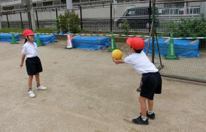 「もっと離れてみよう!」や「次は片手でやってみよう」といろいろ工夫をしながらボール遊びをしていました。