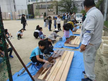 そのベンチに子どもたちの手を借りて、ペンキを塗りました。