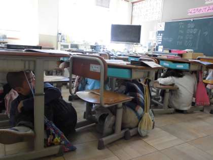 3年前の今日,東日本大震災が起こりました。京都市ではこの日「シェイクアウト訓練」を行います。この訓練は,家庭や学校,職場等で,実施時間になれば一斉に地震発生時における身の安全を守る行動をとるものです。学校でも,この時間に一斉に訓練を行いました。