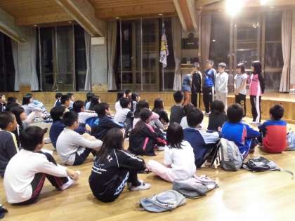 写真は、夜の反省会で、各班が1日目の活動を振り返って、あと3日間をどのように過ごすか、かんたんにパフォーマンスを考えて、工夫した発表会をしているところです。