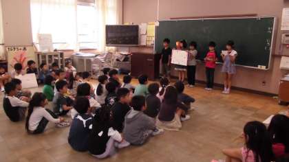 そして,先日1年生の教室へ行き,発表を行いました。初めは緊張していた様子でしたが,一生懸命聞いてくれる1年生を前に,3年生も勇気がわいてきたようで,一人ひとり大きな声でしっかり発表することができました。描いた絵を見せたり,寸劇をやったり,たくさん工夫して頑張りましたね。これからもかっこいい3年生に期待しています!