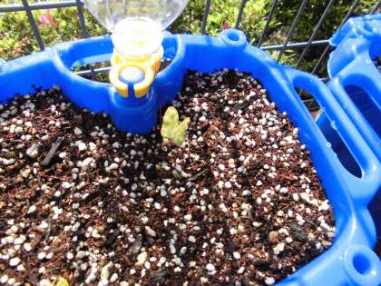 朝、学校に来たらあさがおの水やりをしています。少しずつ芽が出てきました。