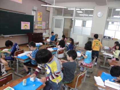 休み時間は、本を読んだり、絵を描いたり、粘土で遊んだりしています。明日からは運動場で遊べることになっており、みんな楽しみにしています。
