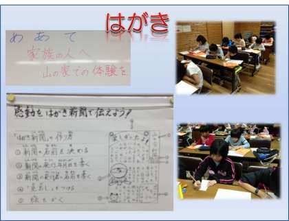 今日まで、花背山の家で体験したことを「はがき新聞」にしておうちの人に伝えます。どんな言葉で、子どもたちは体験したことを伝えるのでしょうか。