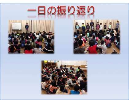 今日の最後の活動は、今日1日の振り返りです。最初にグループごとに振り返りをします。次に、係ごとの振り返りです。次の活動に備えて、振り返ることはとても大切です。何が良かったのか、何が足らなかったのか、各班・各係でできたでしょうか。