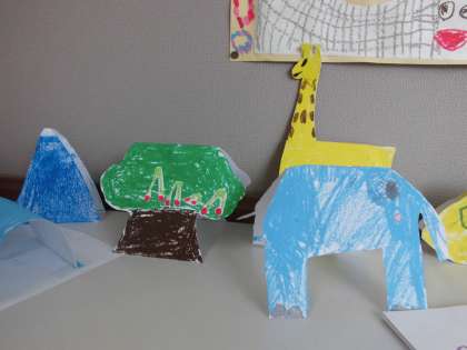 紙を折って、立てて、動物や乗り物などを作りました。うまく立たなかったり、思う形に切れなかったりと、失敗しながらも楽しく作品作りができました。