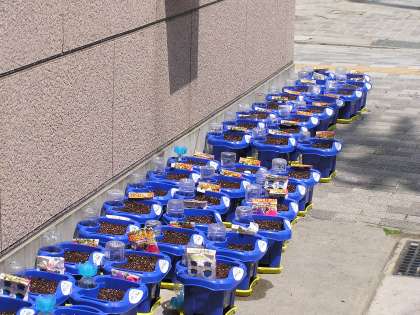 1年生は一人一鉢で「アサガオ」を植木鉢に植え,校門を入った所に並べました。今は,まだ芽も出ていませんがこれからが楽しみです。みんなも心をこめて水やりなど面倒を見てあげてね。