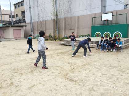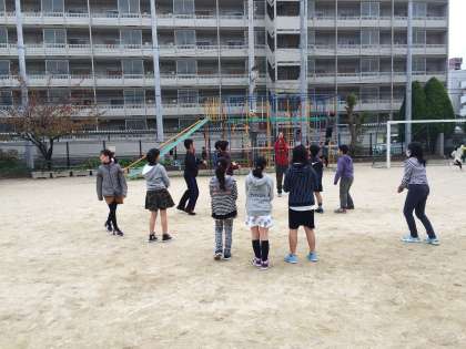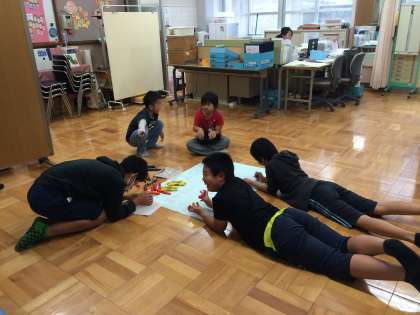 大きな行事がひと段落した次の日。昼休みの子どもたちの様子を見に校内とグラウンドを散策しました。グラウンドではクラス関係なく,楽しそうに「四手」をしている男子グループがいました。その近くでは男女関係なくバレーボールを楽しんでいるグループが。それぞれ,ほのぼのした雰囲気があり,いい笑顔がたくさんありました。校舎内では委員会の発表資料を作っている6年生とその姿を眺めている1年生の姿がありました。お兄さんの姿を見て何を思っていたのか気になりました。