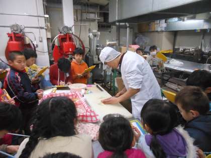 総合「発見たんけん光徳の町」で、校区内にあるかまぼこ工場の見学に行きました。手作業でかまぼこ板の上にすり身を乗せているところや、機械で平天を揚げているところなどを見せていただくことが出来ました。