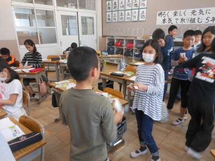 外国語活動の授業では、英語で自己紹介をしました。教室内を自由に歩き、出会った友達に自己紹介をしたうえで、名刺を渡すという活動でした。子どもたちはとても外国語活動の授業が好きな様子で、積極的に話しかける姿が多く見られました。