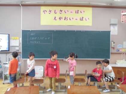 算数「なんばんめ」の学習をしました。一列に並んで座り,呼ばれた人が立ちます。「前から○ばんめ」と「前から○人」のちがいを考えることができました。