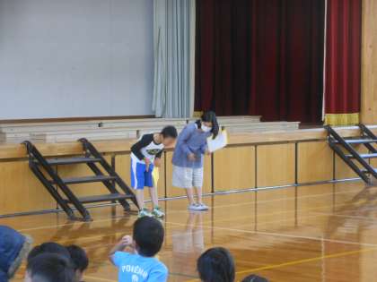 1年生を迎える会がありました。5年生は,折り紙で作ったメダルを1年生にプレゼントしました。また,司会やはじめの言葉,終わりの言葉を5年生の計画委員が行いました。練習を重ねてスムーズに進行することができました。