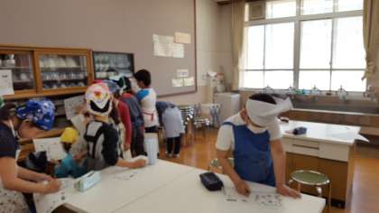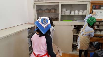 先日の家庭科では,家庭科室の探検をしました。プリントに載っている調理用具の写真と名前を見ながら,どこにどんな用具があるのか確かめました。