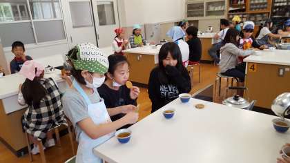 家庭科室探検の後,ガスコンロの使い方を確認し,ほうじ茶と一緒にちょっとしたお菓子をみんなで食べました。少しのお菓子とお茶があるだけで,とても和やかな雰囲気になり楽しかったです。また安全にガスやヤカン等を扱い,役割も分担しながらスムーズに活動することができていました。