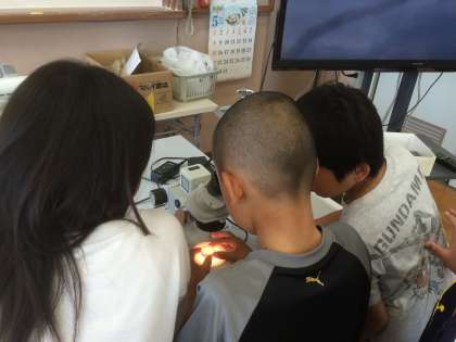 また,同時にメダカの観察もしています。つい先日理科室で子メダカが生まれたようで,顕微鏡を使い,小さな体を確認していました。
