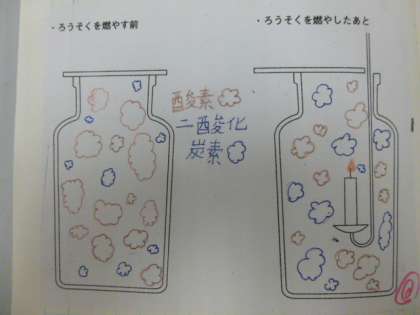 ものが燃える前と燃えた後の空気の様子を実験によって確かめたことを絵で表しました。子どもたちがどのように理解しているかよくわかります。