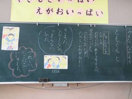 「ともくんと」という教材を使って「友だちと仲良くする」ことについて考えました。授業の最後には,「小学校に入って新しい友だちができて,一緒に遊んで楽しかった。」「友だちと仲良く遊べてうれしい。」など,自分の思いを話していました。