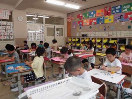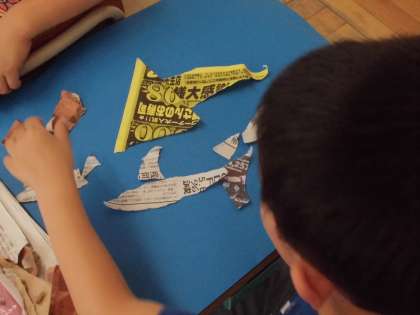 「紙をやぶいたらきょうりゅうに見えてきた!」「この形はまるでしんかんせんみたいだね!」楽しみながら紙をやぶいて,自分の好きな色の画用紙に貼っていきました。最後にクレパスで絵を付け足し,とってもすてきな作品が出来上がりました!!