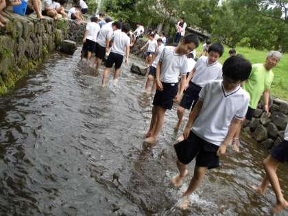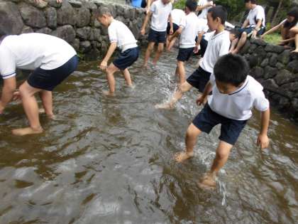 3日目の最初の活動は「魚つかみ」です。逃げ泳ぐ魚を上手に捕まえられたでしょうか?捕まえた魚は、炭火で焼いていただきます。