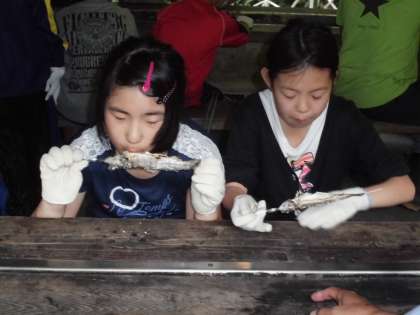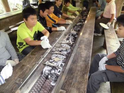 捕った魚を、ハサミで上手にさばきます。中の内臓などを取除き、金串を刺します。