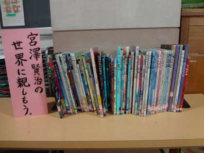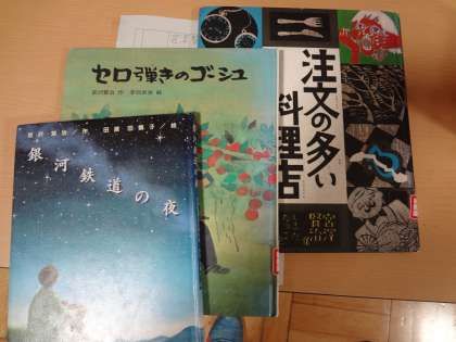 国語科ではもうすぐ,宮沢賢治の「やまなし」の学習に入ります。事前に音読の宿題を出していますが,宮沢賢治の他の作品にも親しんでほしいので,京都市の図書館から作品を借りてきました。様々な作品があるので,多くの本を読み,その世界観を感じてほしいなと思います。