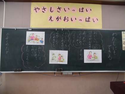 主人公のユンが、家族のためにチヂミを作ります。家族の人がそのチヂミを食べて喜んでくれたときのユンの気持ちを考えました。すると,子どもたちは「私も家族のために料理をしてみたい」「お皿洗いをがんばって続けたい」など,家族のためにお手伝いをがんばろうという思いをもつことができました。