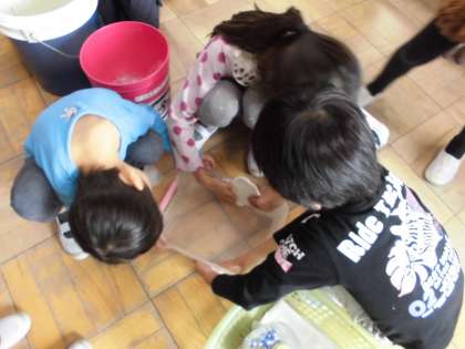 身の回りには,いろいろなでこぼこがあります。教室の中にはどんなでこぼこがあるのか探してみました。そして粘土にうつしとって,いろいろな形の面白さを味わいました。「ワッフルみたい」「ぞうの顔みたい」「キリンの模様みたい」など,みんなお気に入りのでこぼこを見つけていました。