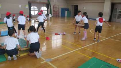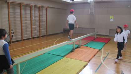2年生は15日(火)に体育で「マットあそび」をしました。前転や後転など1年生の時にも学習したまわり方で、マット遊びを行いました。後転を行う際には、踏み切り板をマットの下に入れて、まわりやすいように活動の場を作りました。グループを中心に協力して、活動の場を作る姿はとても気持ちの良いものでした。学習の最後には、平均台をバランスを取って歩く活動もしました。落ちないようにゆっくりと、楽しみながら渡っていました。