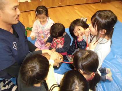 4名の獣医さんと,4羽のウサギさんが来てくれました。獣医さんの仕事やウサギさんのことについて質問をしたり,ウサギさんを抱っこしたり,心音を聞いたりしました。子どもたちは,「ふわふわ!」「心臓の音が速い!」「かわいいね!」と言いながら,ウサギさんとのふれあいを楽しみました。