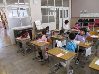 学級目標が「あそぶときには,みんなであそんで,べんきょうするときは先生のはなしをきく」に決定しました。目標の周りには,以前に描いた似顔絵を貼りました。
