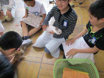 3月に学校へ来たうさぎの絵を描きました。1人ずつ抱っこをして、よく観察をした上で、とりかかりました。「目はどんな風になっている?」と動いているうさぎを目で追うのが大変そうでしたが、本物を目の前にとても楽しそうでした。