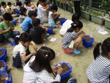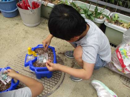 生活の学習では,あさがおのたねを植えました。