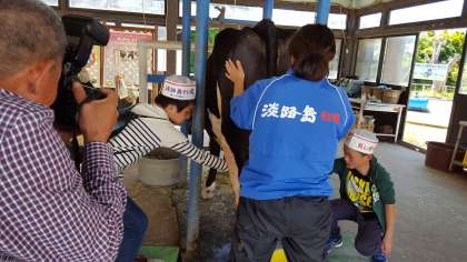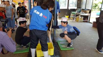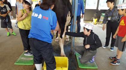牛の乳しぼり体験です。こわごわしぼっているようです。こしがひけているのかな。