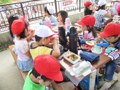 おうちの人が用意してくださったお昼ご飯をおいしそうに食べる子どもたちでした。