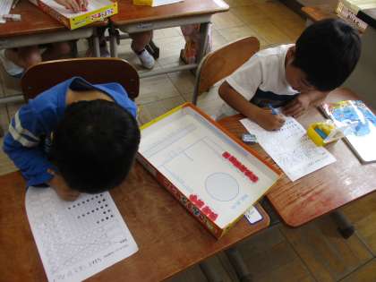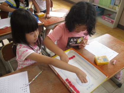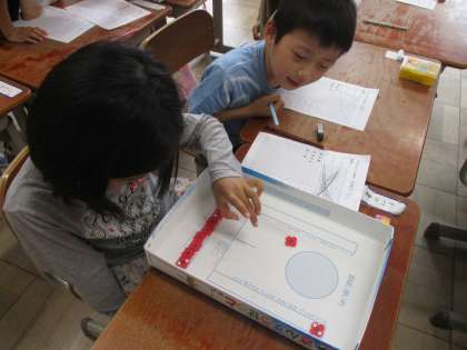 今日はおはじきを使ったゲームをしながら,10をいくつといくつにわけられるか考えました。おはじきをとばして,円の中に入ったら色をぬることができます。最後,色をぬったものとぬっていないものを見て,いくつといくつに分けられたか確認します。