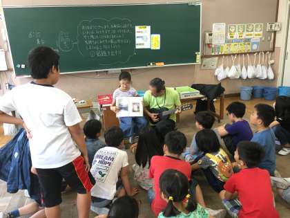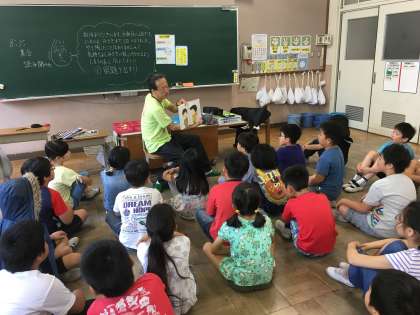 今日の朝の読み聞かせはいつもと少し違い,わぁのなかまの方がギタレレ(ウクレレとギターの中間のような楽器)を使い,弾き語りをしてくださいました。子どもたちも前のめりになりながら,見て聴いて楽しんでいました。