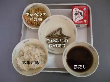 今日の献立は,『玄米ご飯』『赤だし』『キャベツのごま煮』『きびなごの琥珀揚げ』『牛乳』です。