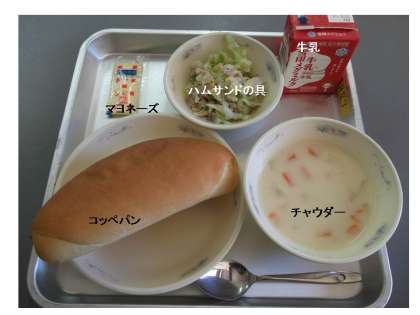 今日の献立は『コッペパン』『チャウダー』『ハムサンドの具』『マヨネーズ』『牛乳』です。