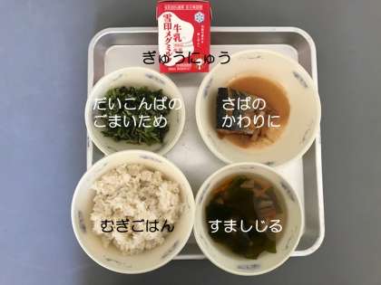 今日の献立は,『さばのかわり煮』『大根葉のごまいため』『すまし汁』『麦ごはん』『牛乳』です。