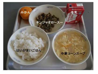 今日の給食は,『胚芽米ご飯』『チンジャオロースー』『中華コーンスープ』『牛乳』『みかん』です。