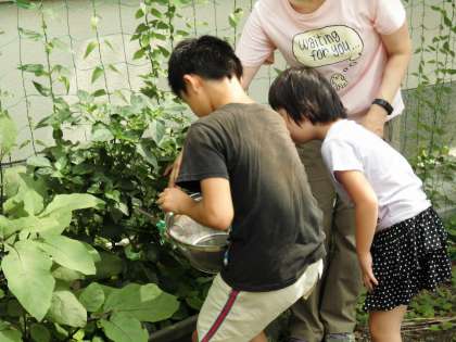 とれたての野菜でトマトソースを作るので,みんなわくわくしながらの収穫となりました。
