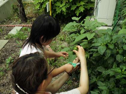 みんなで,育てているバジルやピーマン,トマトを収穫しました。