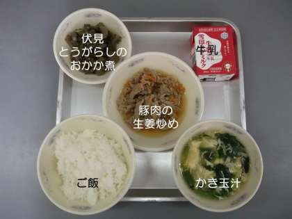今日の献立は,『ご飯』『かき玉汁』『伏見とうがらしのおかか煮』『豚肉の生姜炒め』『牛乳』です。