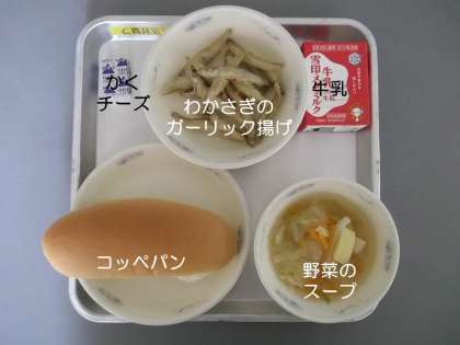 今日の献立は,『コッペパン』『野菜のスープ』『かくチーズ』『わかさぎのガーリック揚げ』『牛乳』です。