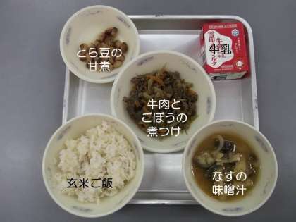今日は,『和(なごみ)献立』で,『玄米ご飯』『なすの味噌汁』『とら豆の甘煮』『牛肉とごぼうの煮つけ』『牛乳』です。